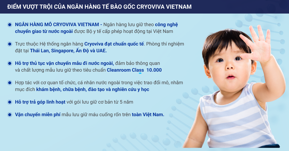 Cryoviva Vietnam chuyên môn hoá lưu trữ và nuôi cấy tế bào với công nghệ tiên tiến nhất nhằm đảm bảo chất lượng tế bào và phối hợp với các bệnh viện nghiên cứu lâm sàng, đưa tế bào gốc ứng dụng vào điều trị.